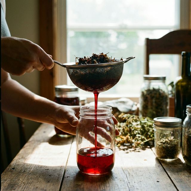 Pour the mixture through cheesecloth or a fine-mesh sieve into a clean bowl or apothecary jar. Be sure to squeeze the plant material tightly to extract every last drop of the precious red medicine. Store your finished infused oil in a cool, dark cabinet.